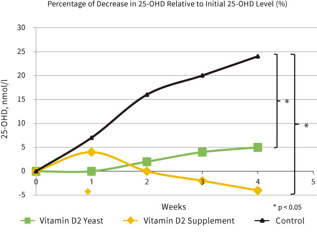 Vitamin D2 from yeast had an equal effect on 25 (OH) D concentration as a vitamin D2-containing supplement during a 4-week trial.
